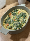 - Dans un plat à gratin, verser l’huile d’olive, l’orzo, l’oignon, l’ail, les épinards, les tomates découpées.